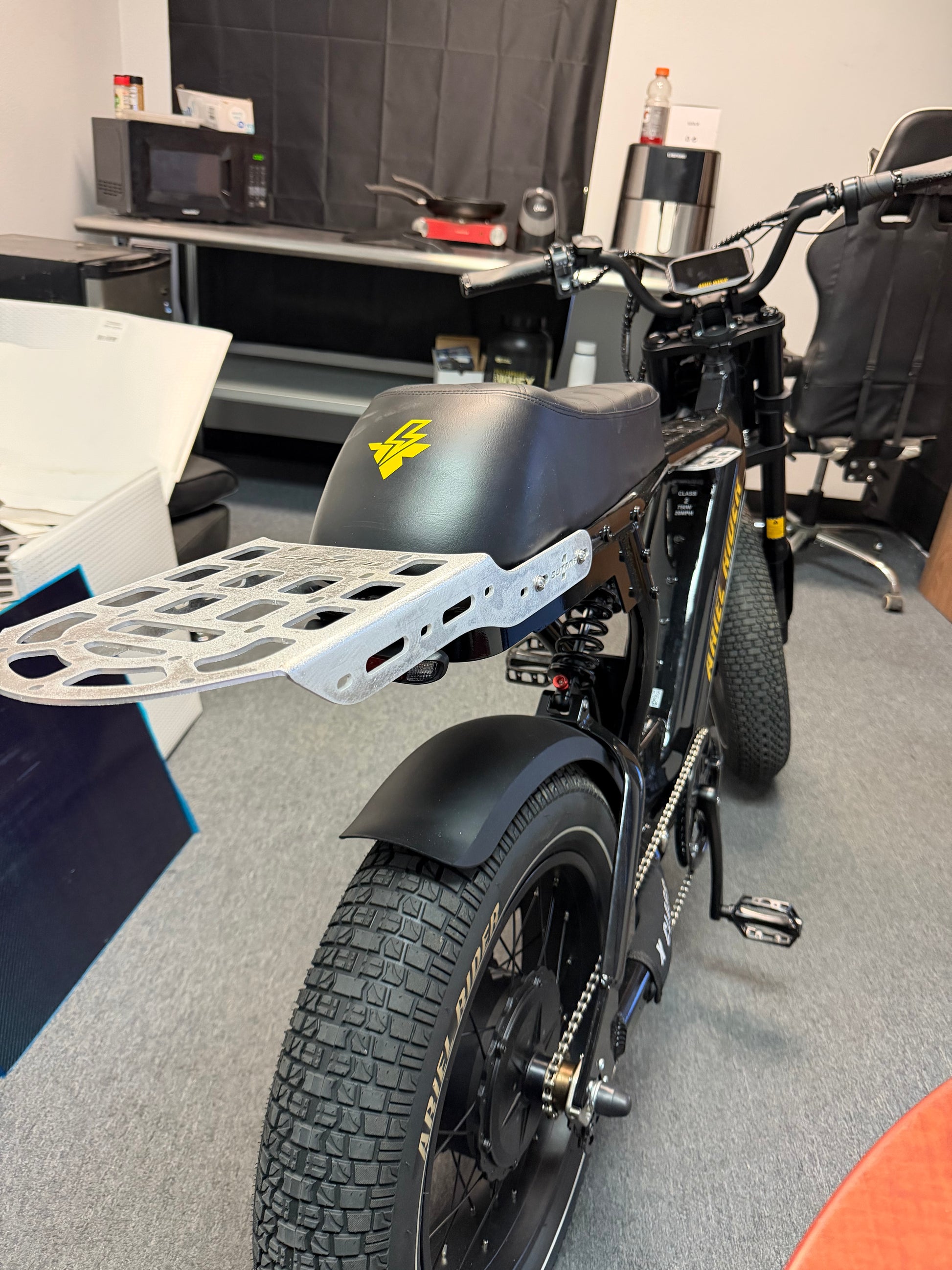 Ariel Rider XClass 60V Performance Rear Molle Rack. This is made out of aluminum which allows you to carry ore items on your bike whether its groceries, coolers, packing supplies, Spare parts, ect.. It has many different mounting holes and slots to allow you to be able to mount almost anything! This mounts to the factory holes on your Ariel Rider making it easy to install!